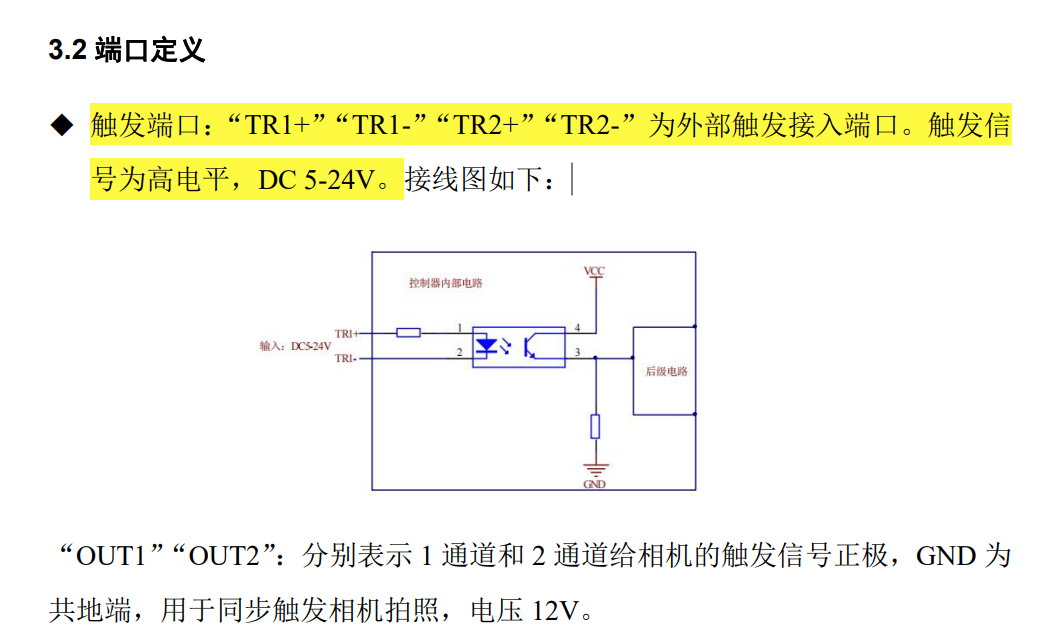 1、光源控制器控制拍照:一般采用频闪增亮光源,外部触发信号接入控制器,然后控制器再输出触发信号给相机,完成相机和光源的同步。按照这种接线方法,有时可以使用,但也很多时候会出现相机拍出来黑图的情况。咨询了控制器厂家,也没有彻底解决。