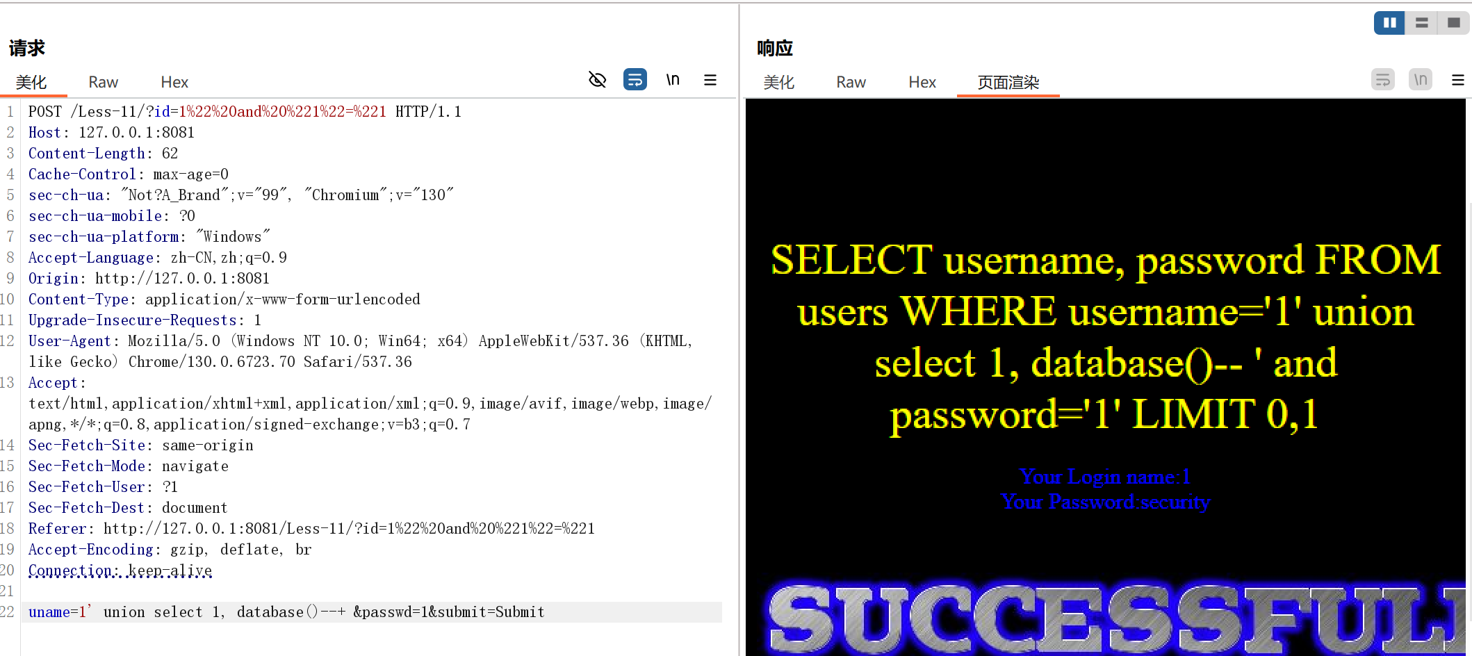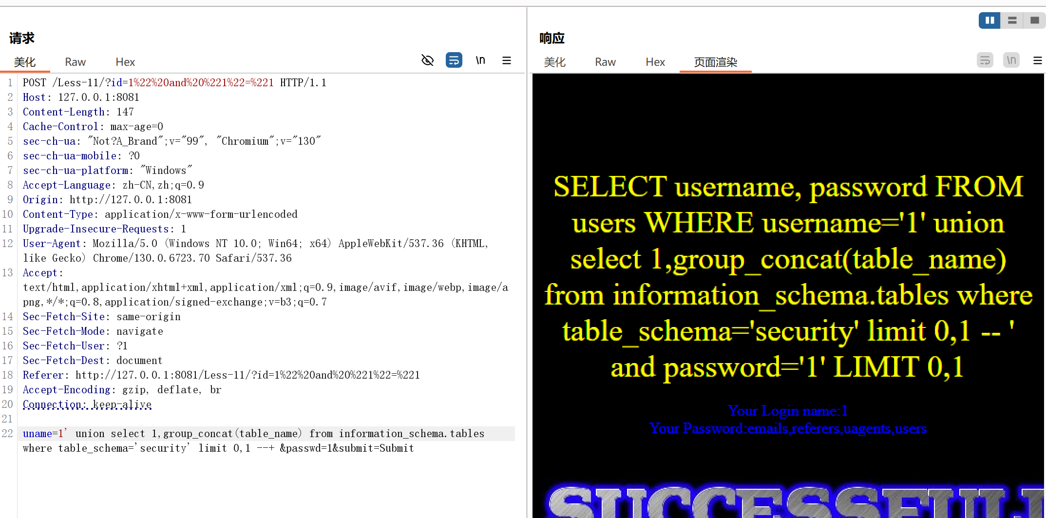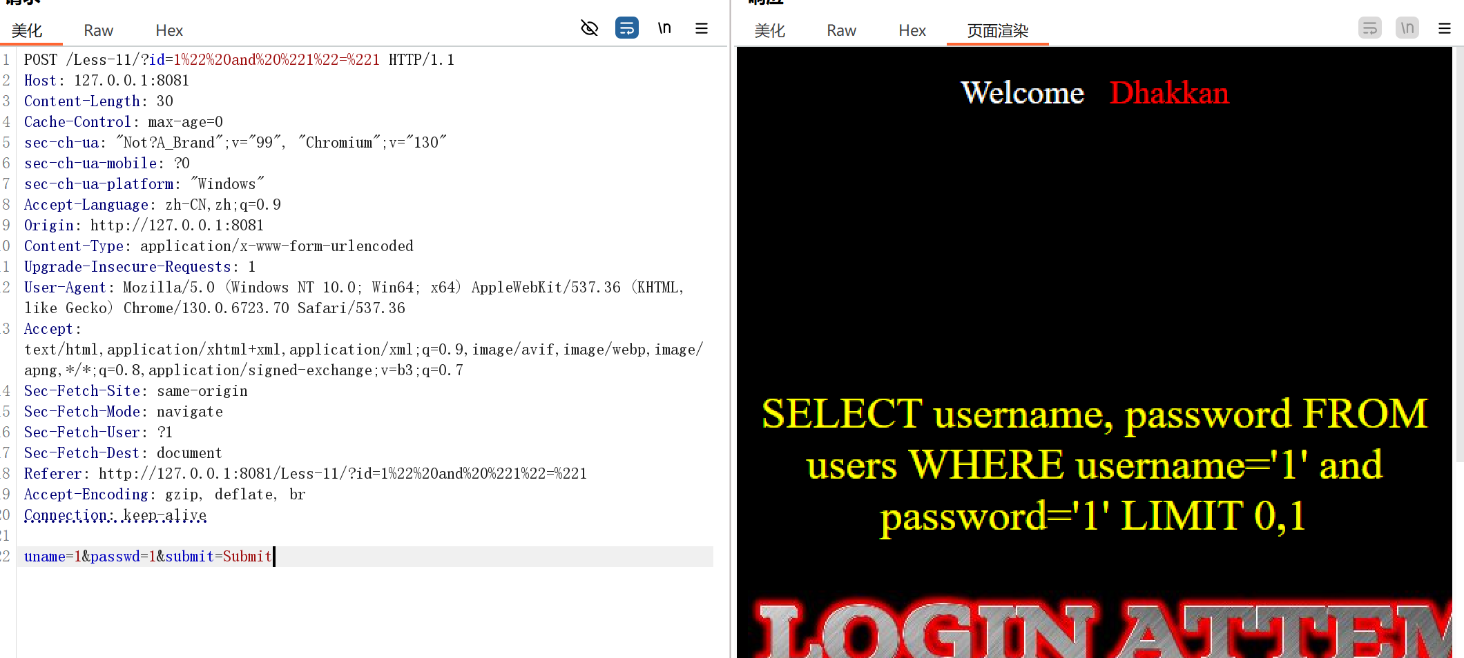 http://127.0.0.1:8081/Less-11/?id=1" and "1"="1