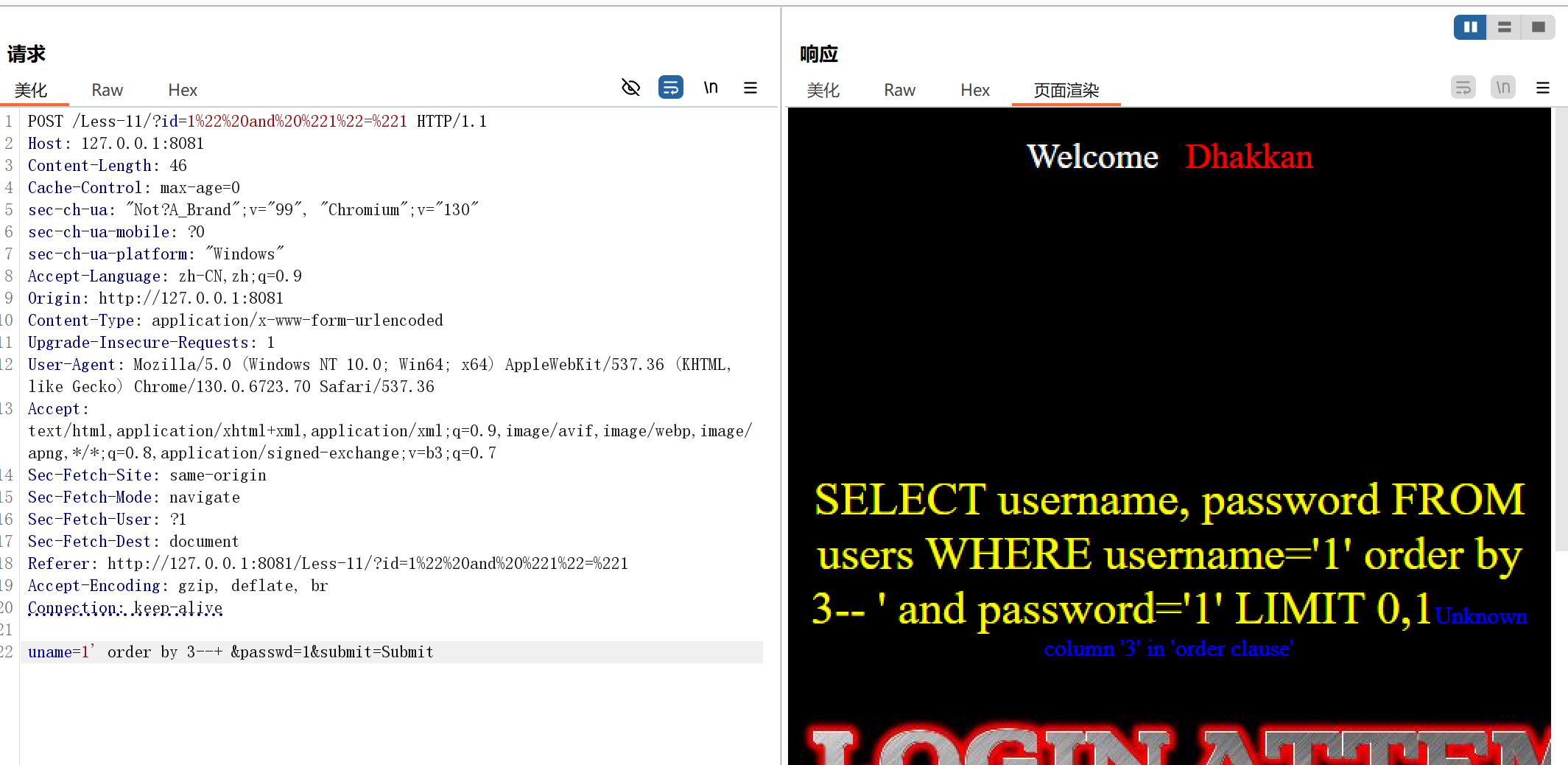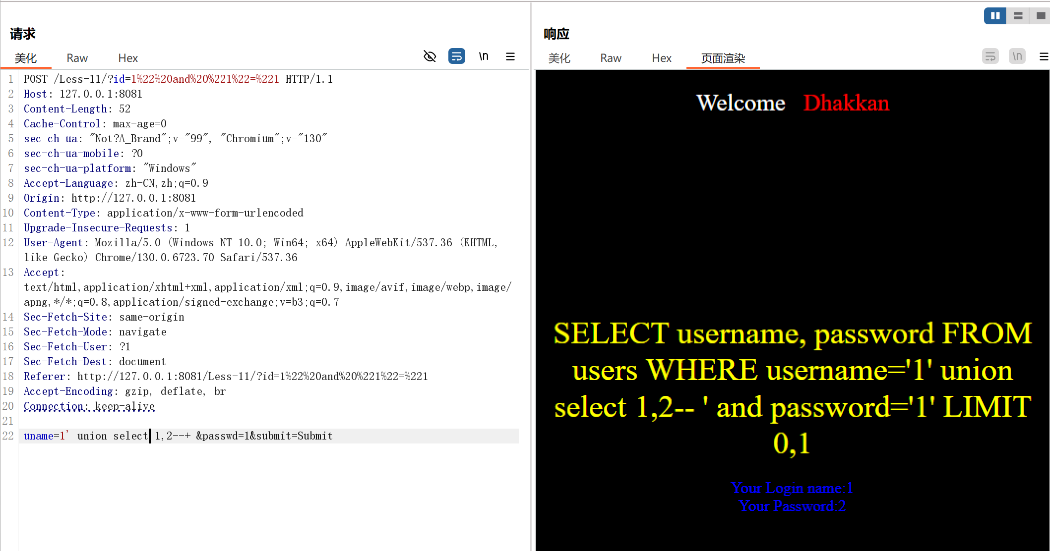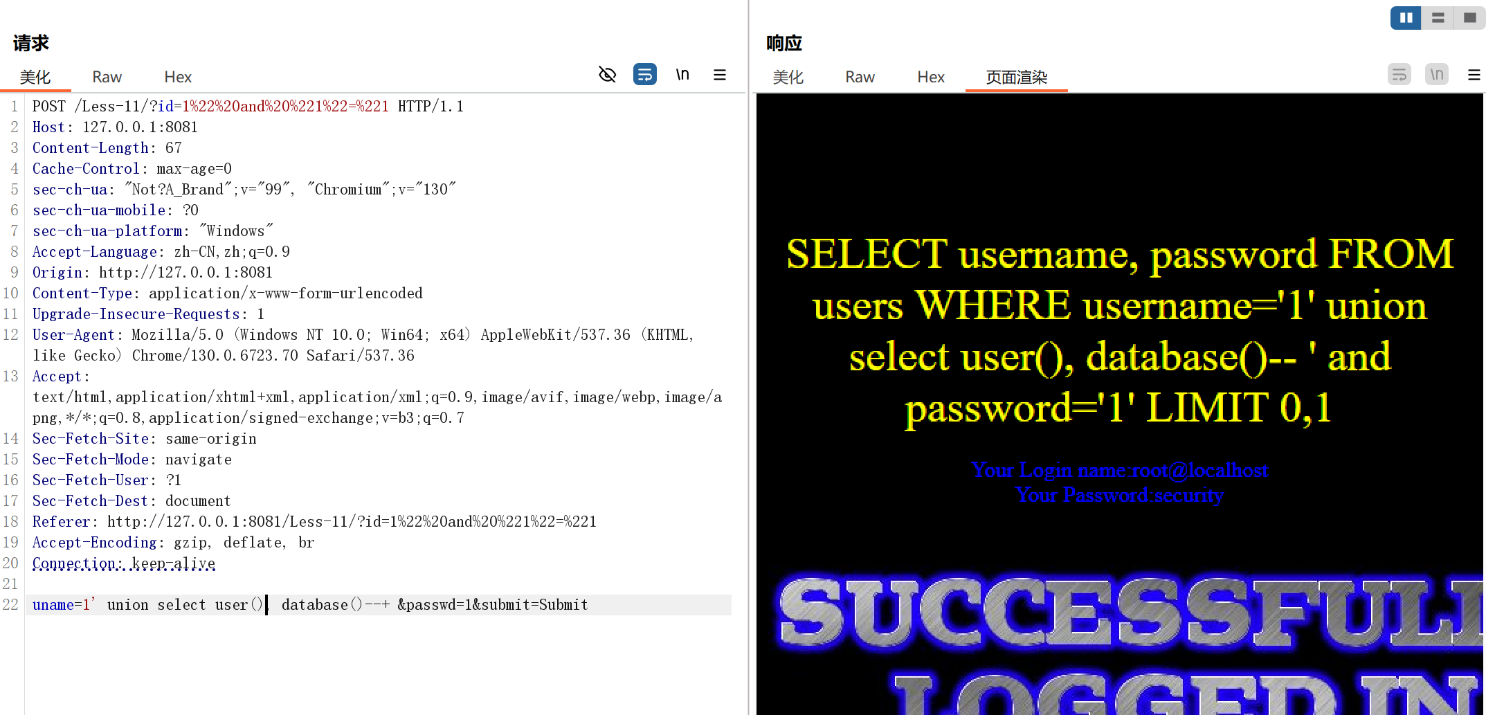 http://127.0.0.1:8081/Less-11/?id=1" and "1"="1