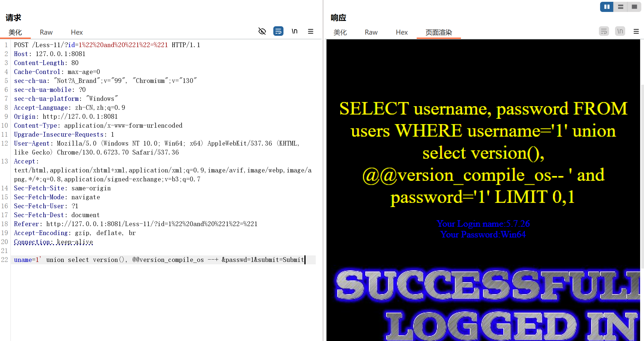 http://127.0.0.1:8081/Less-11/?id=1 and 1=1