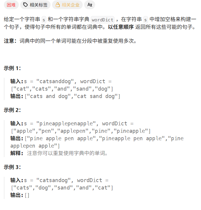 class Solution {public List<String> wordBreak(String s, List<String> wordDict) {Map<Integer, List<List<String>>> map = new HashMap<Integer, List<List<String>>>();List<List<String>> wordBreaks = backtrack(s, s.length(), new HashSet<String>(wordDict), 0, map);List<String> breakList = new LinkedList<String>();for (List<String> wordBreak : wordBreaks) {breakList.add(String.join(" ", wordBreak));}return breakList;}public List<List<String>> backtrack(String s, int length, Set<String> wordSet, int index, Map<Integer, List<List<String>>> map) {if (!map.containsKey(index)) {List<List<String>> wordBreaks = new LinkedList<List<String>>();if (index == length) {wordBreaks.add(new LinkedList<String>());}for (int i = index + 1; i <= length; i++) {String word = s.substring(index, i);if (wordSet.contains(word)) {List<List<String>> nextWordBreaks = backtrack(s, length, wordSet, i, map);for (List<String> nextWordBreak : nextWordBreaks) {LinkedList<String> wordBreak = new LinkedList<String>(nextWordBreak);wordBreak.offerFirst(word);wordBreaks.add(wordBreak);}}}map.put(index, wordBreaks);}return map.get(index);}