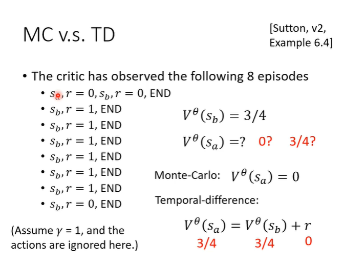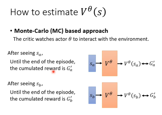 MC方法是将actor与环境互动很多轮,得到很多训练资料,当看见s_a时输出应该与G'_a越近越好,这是一种很直观的做法。