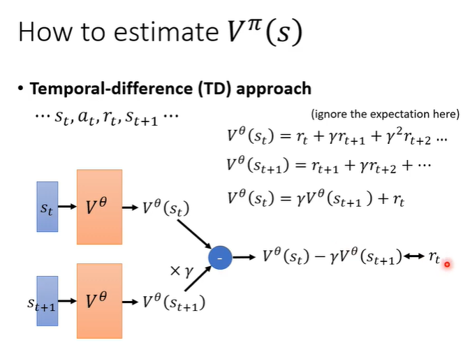 TD方法是希望不用玩完整场游戏才能得到训练资料,而是看见s_t,a_t,r_t,s_t+1就可以拿来更新V(s)的参数。这样的好处是当游戏时间较长甚至不会结束时,同样可以训练V(s)。观察V(s_t)与V(s_t+1),不难看出他们的关系,训练方法就是计算V(s_t)与V(s_t+1),虽然不知道他们应该是多少,但是知道他们应该符合他们的关系式。所以可以通过{s_t,a_t,r_t,s_t+1}这样一笔资料进行训练。