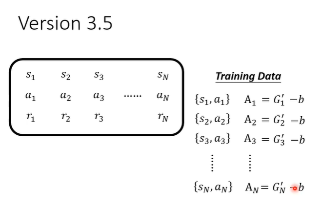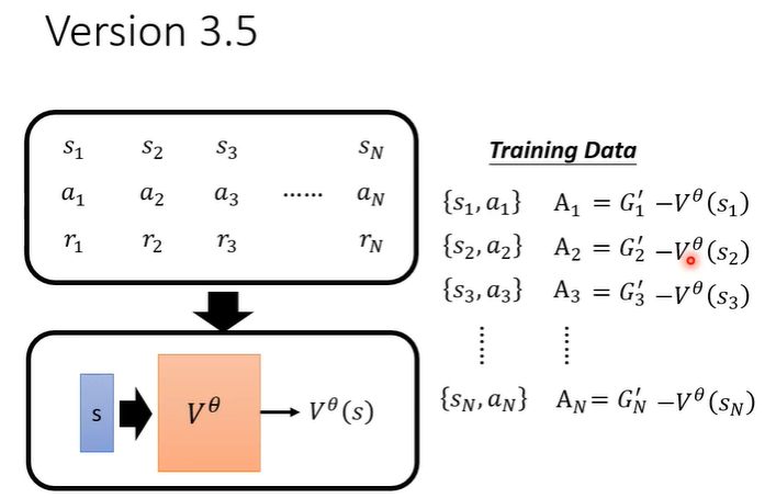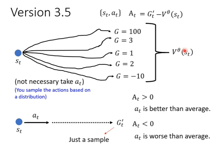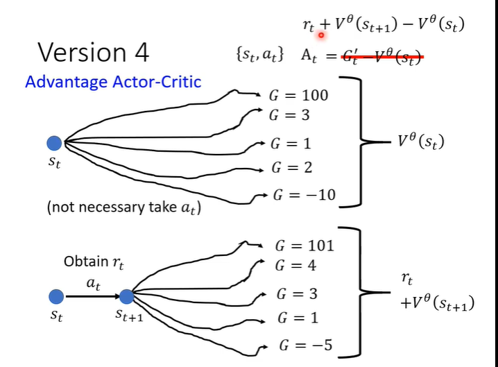但是G'是一个sample的结果,即执行a后一直到游戏结束的一个结果,把一个sample减去平均并不合理。所以需要“平均减平均”,执行完a_t后得到r_t,在s_t的后一个画面s_t+1一直玩下去就得到很多可能,平均起来就是V(s_t+1),再加上r_t,代表原来的G'。