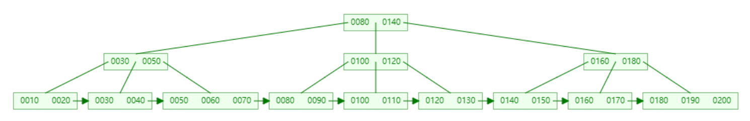 - 所有数据都保存在叶子结点中 , 非叶子结点仅保存索引键 , 形成有序链表 , 支持范围查找