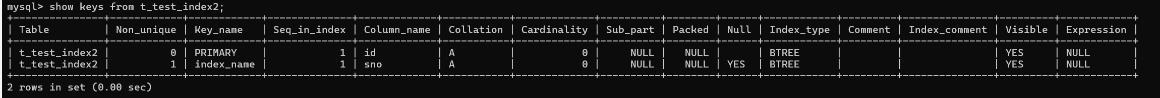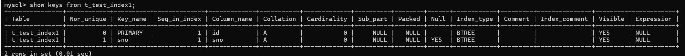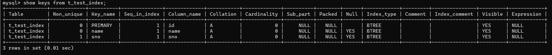 create table t_test_index(id bigint primary key auto_increment,name varchar(20) unique,sno varchar(10),index(sno)