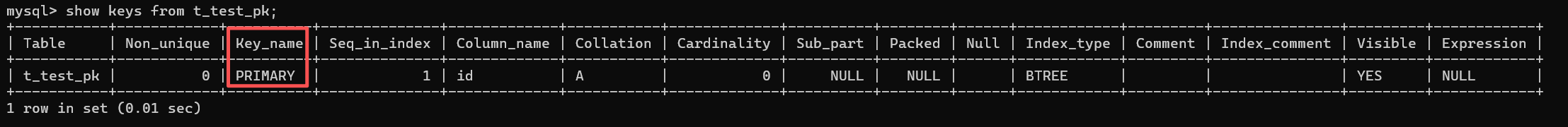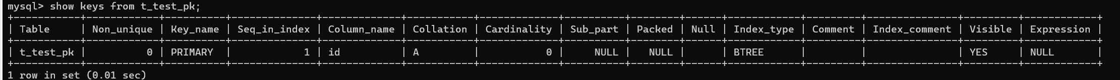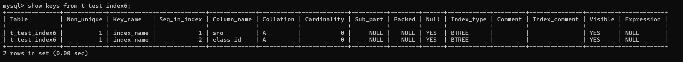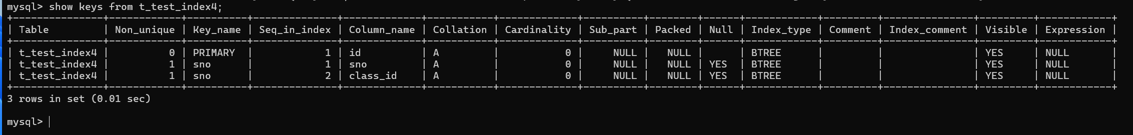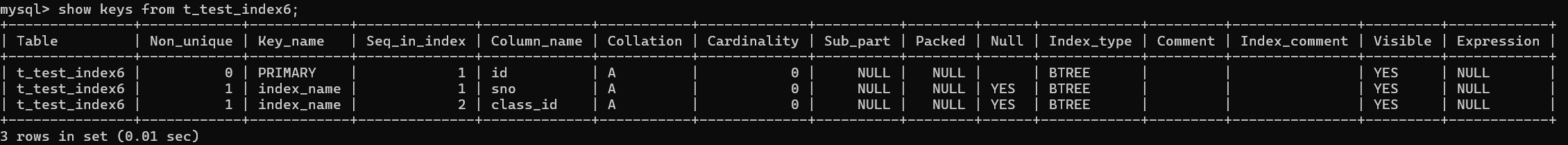 create table t_test_index4(id bigint primary key auto_increment,name varchar(20),sno varchar(10),class_id bigint,index(sno,class_id) # 复合主键