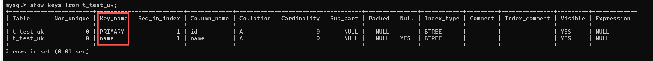 create table t_test_uk1(id bigint primary key auto_increment,name varchar(20),unique (name)
