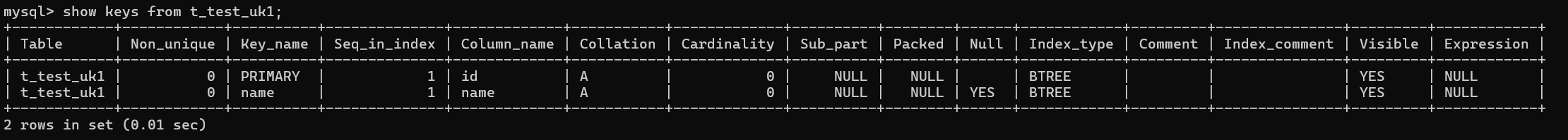 create table t_test_uk(id bigint primary key auto_increment,name varchar(20) unique