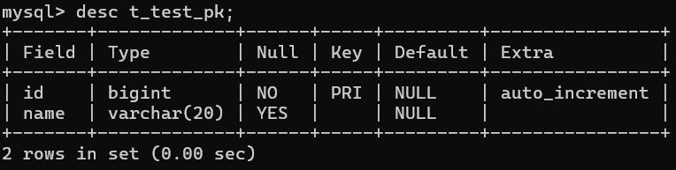 create table t_test_pk(id bigint primary key auto_increment,name varchar(20)