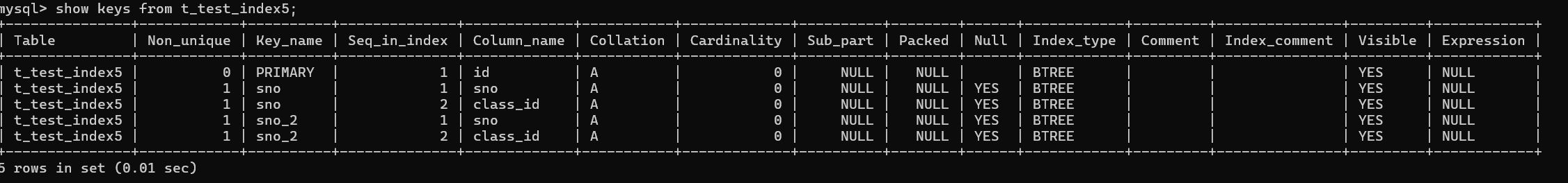 create table t_test_index5(id bigint primary key auto_increment,name varchar(20),sno varchar(10),class_id bigint