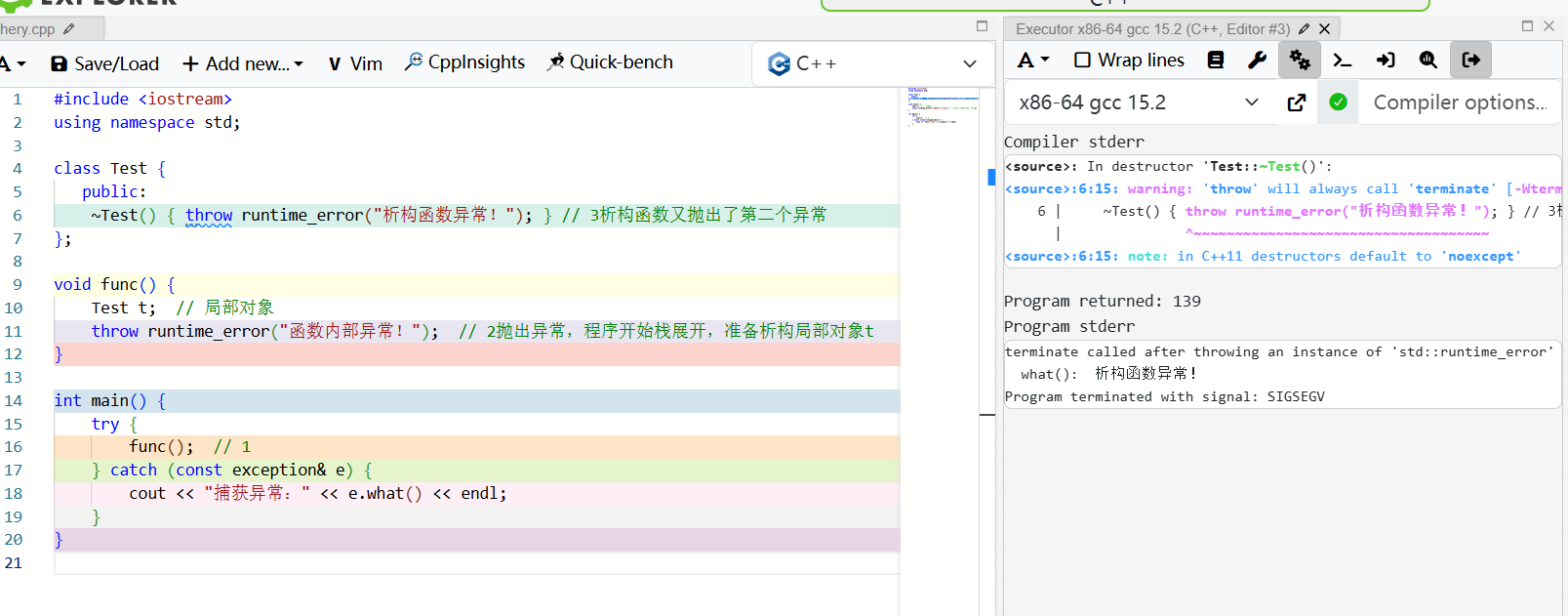 using namespace std;class Test {public:~Test() { throw runtime_error("析构函数异常!"); } // 3析构函数又抛出了第二个异常