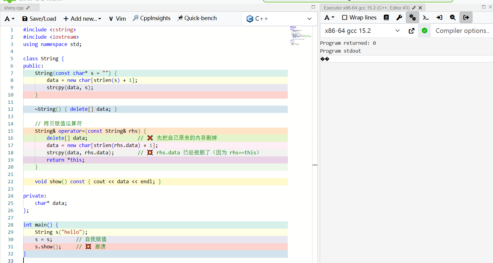 public:A operator=(const A& rhs) { // 返回一个“副本”,注意:返回类型是 A(值),不是 A&// 拷贝数据...return *this; // 返回一个临时对象}