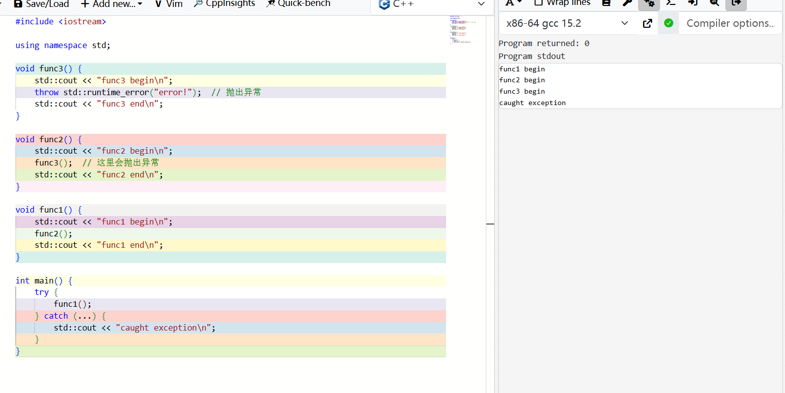 栈展开:当异常被抛出后,程序未来找到合适的catch块,会依次退出当前函数调用栈中的函数,并在退出的过程中自动调用已构造对象的析构函数。