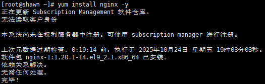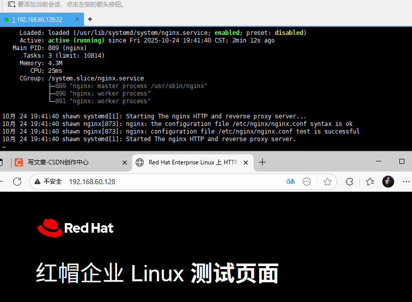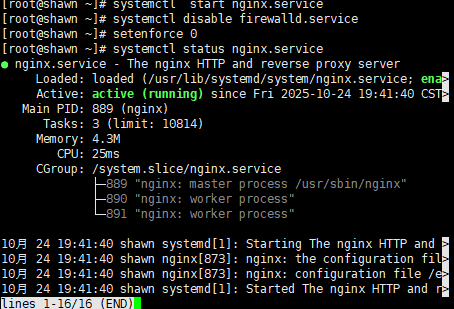 [root@server ~]# setenforce 0 [root@server ~]# systemctl stop firewalld[root@server ~]# systemctl disable firewalld[root@server ~]# yum install nginx mod_ssl -y[root@server ~]# systemctl start nginx # 启动[root@server ~]# systemctl enable nginx # 设置开机启动