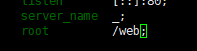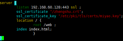 server {listen 443 ssl http2;listen [::]:443 ssl http2;root /web/https;ssl_certificate "/etc/nginx/conf.d/zhengshu.crt";ssl_certificate_key "/etc/nginx/conf.d/miyao.key";