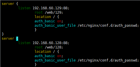 server {listen 192.168.60.128:80location / {root /web/128;auth_basic on;auth_basic_user_file /etc/nginx/conf.d/auth_passwd;}}