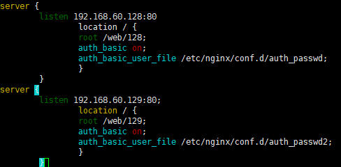 server {listen 192.168.60.129:80;location / {root /web/129;auth_basic on;auth_basic_user_file /etc/nginx/conf.d/auth_passwd2;}
