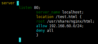 location /test.html {root /usr/share/nginx/html;allow 192.168.1.0/24; # 允许来自192.168.1.0/24网段的请求deny all; # 拒绝其他所有请求}