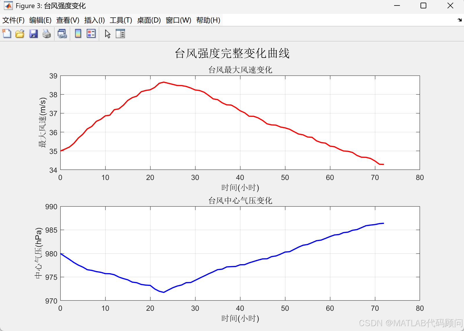 for i = 1:nsubplot(2,2,1);plot(lon(1:i), lat(1:i), 'b-', 'LineWidth',1.5); % 路径plot(lon(i), lat(i), 'ro', 'MarkerSize',8, 'LineWidth',2); % 当前位置% 绘制强度相关图表subplot(2,2,2);plot(t(1:i), V_max(1:i), 'r-', 'LineWidth',1.5);xlabel('时间(小时)'); ylabel('最大风速(m/s)');title('台风最大风速变化');grid on;subplot(2,2,3);plot(t(1:i), P_center(1:i), 'b-', 'LineWidth',1.5);xlabel('时间(小时)'); ylabel('中心气压(hPa)');title('台风中心气压变化');grid on;% 显示当前信息subplot(2,2,4);text(0.1, 0.6, ['时间: ' num2str(t(i)) '小时'], 'FontSize',12);text(0.1, 0.5, ['位置: (' num2str(lon(i),2) ',' num2str(lat(i),2) ')'], 'FontSize',12);text(0.1, 0.4, ['风速: ' num2str(V_max(i),2) 'm/s'], 'FontSize',12);text(0.1, 0.3, ['气压: ' num2str(P_center(i),3) 'hPa'], 'FontSize',12);text(0.1, 0.2, ['移速: ' num2str(speed(i),2) 'km/h'], 'FontSize',12);text(0.1, 0.1, ['方向: ' num2str(direction(i),0) '度'], 'FontSize',12);axis off;drawnow; % 实时更新图形pause(0.1); % 控制动画速度