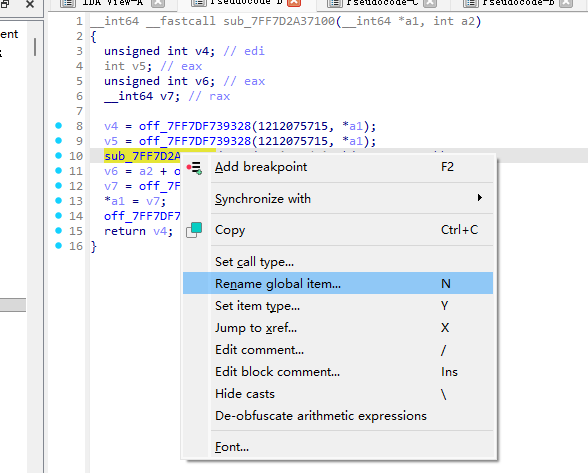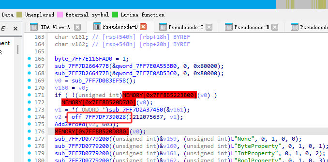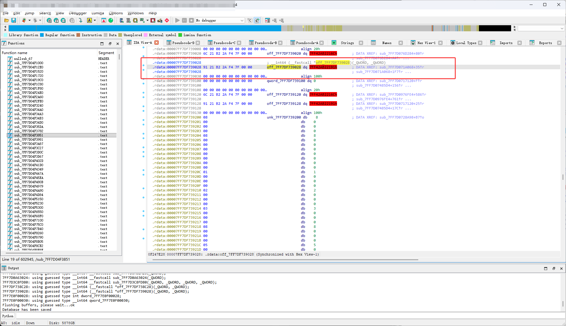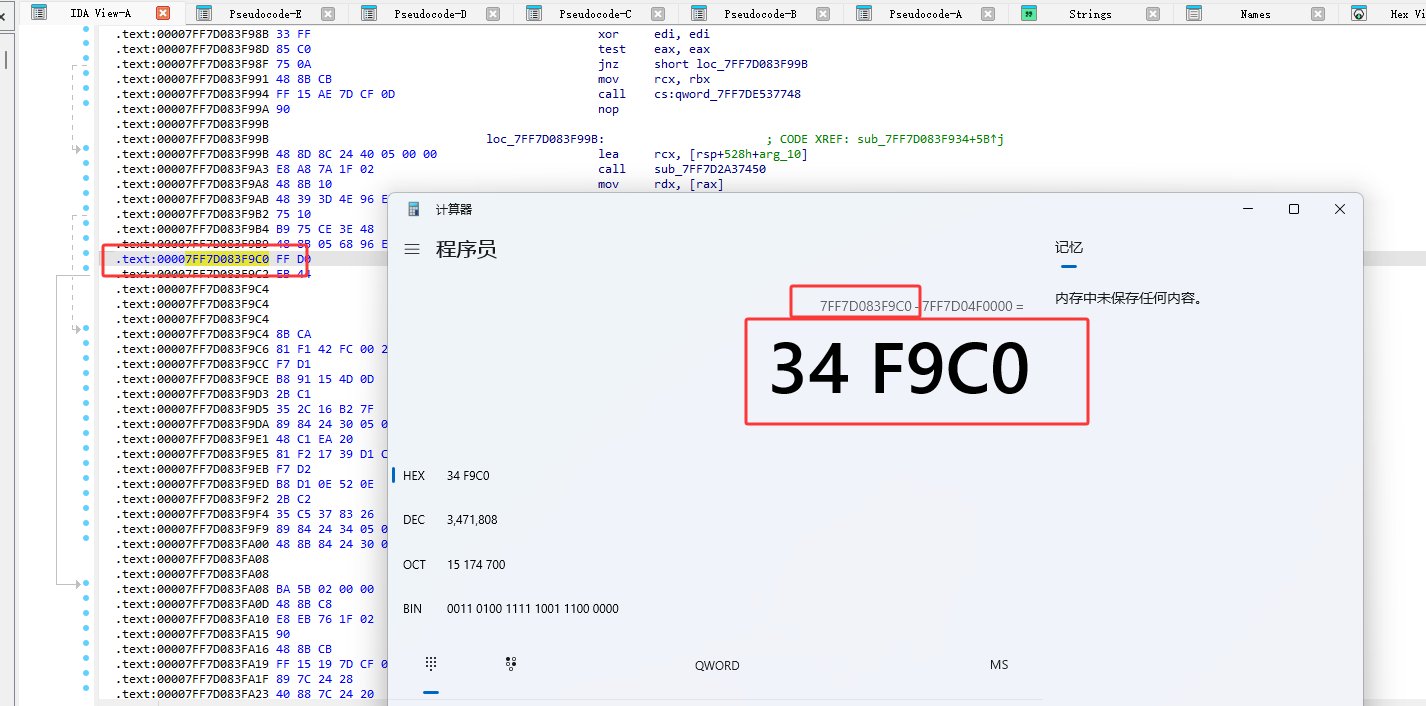 然后找到off_7FF7DF739028这一行代码的地址,如下图,首先点击下图红框,然后找到下图黄框,然后复制下图蓝框
