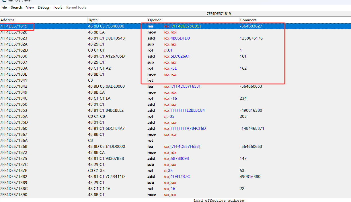 | 7FF4DE571819 | 48 8D 05 75840000 | lea rax,[7FF4DE579C95] | 将地址7FF4DE579C95加载到RAX寄存器 |