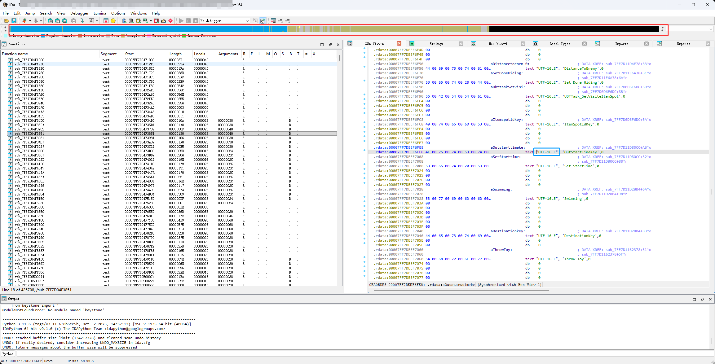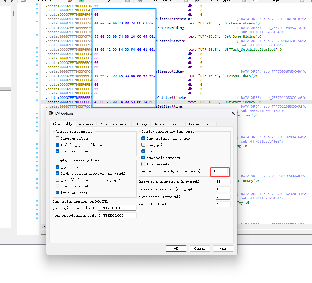然后再搜索字符串之前需要设置一下ida的编码,鼠标在下图红框里拖动(要慢点拖),然后就可以看到下图蓝框里的内容UTF-16LE,这个就是游戏中使用的编码(注意要IDA加载完成,加载不完成可能看不到)