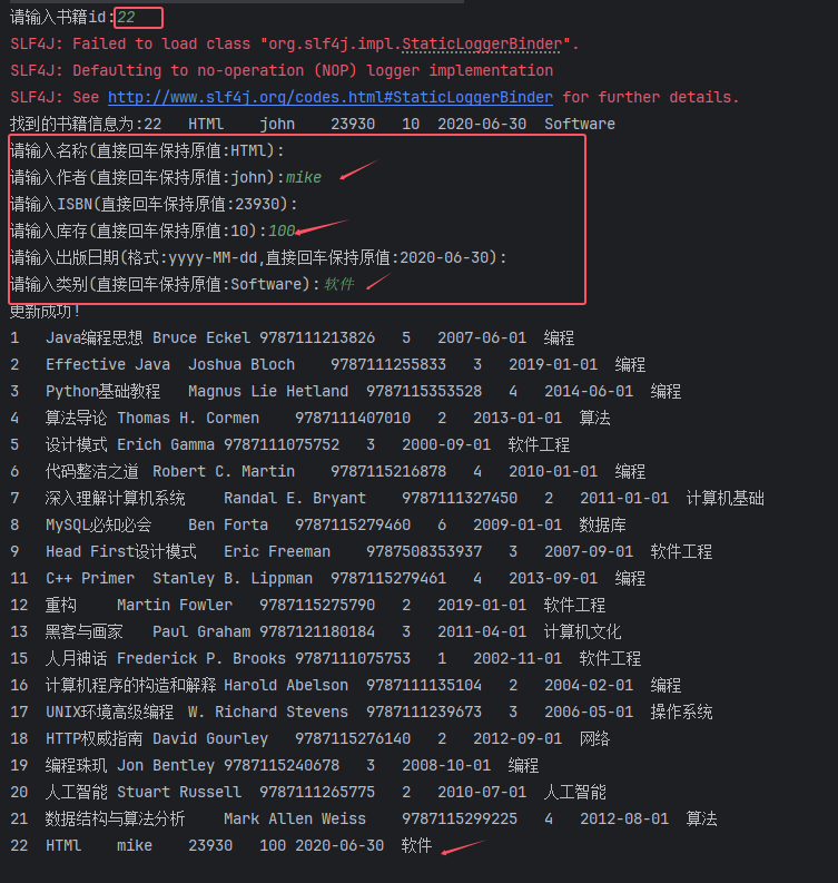 private static void tt3() {Scanner scanner = new Scanner(System.in);BookBiz bookBiz = new BookBiz();try {//查找书籍System.out.print("请输入书籍id:");int id = scanner.nextInt();Book book = bookBiz.getBookById(id);if (book != null) {System.out.println("找到的书籍信息为:" + book);scanner.nextLine(); // 清除换行符//获取当前值作为默认值String defaultTitle = book.getTitle();String defaultAuthor = book.getAuthor();String defaultIsbn = book.getIsbn();int defaultStock = book.getStock();java.sql.Date defaultDate = book.getPublishDate();String defaultCategory = book.getCategory();//更新书籍信息System.out.print("请输入名称(直接回车保持原值:" + defaultTitle + "):");String titleInput = scanner.nextLine();String title = titleInput.isEmpty() ? defaultTitle : titleInput;System.out.print("请输入作者(直接回车保持原值:" + defaultAuthor + "):");String authorInput = scanner.nextLine();String author = authorInput.isEmpty() ? defaultAuthor : authorInput;System.out.print("请输入ISBN(直接回车保持原值:" + defaultIsbn + "):");String isbnInput = scanner.nextLine();String isbn = isbnInput.isEmpty() ? defaultIsbn : isbnInput;System.out.print("请输入库存(直接回车保持原值:" + defaultStock + "):");String stockInput = scanner.nextLine();int stock = stockInput.isEmpty() ? defaultStock : Integer.parseInt(stockInput);System.out.print("请输入出版日期(格式:yyyy-MM-dd,直接回车保持原值:" + defaultDate + "):");String dateInput = scanner.nextLine();java.sql.Date publishDate = dateInput.isEmpty() ? defaultDate : Date.valueOf(dateInput);System.out.print("请输入类别(直接回车保持原值:" + defaultCategory + "):");String categoryInput = scanner.nextLine();String category = categoryInput.isEmpty() ? defaultCategory : categoryInput;//创建新的书籍对象Book newBook = Book.builder().id(id).title(title).author(author).isbn(isbn).stock(stock).publishDate(publishDate).category(category).build();//更新书籍信息bookBiz.update(newBook);} else {System.out.println("没有找到对应的书籍");}} catch (Exception e) {throw new RuntimeException(e);}}六、运行效果