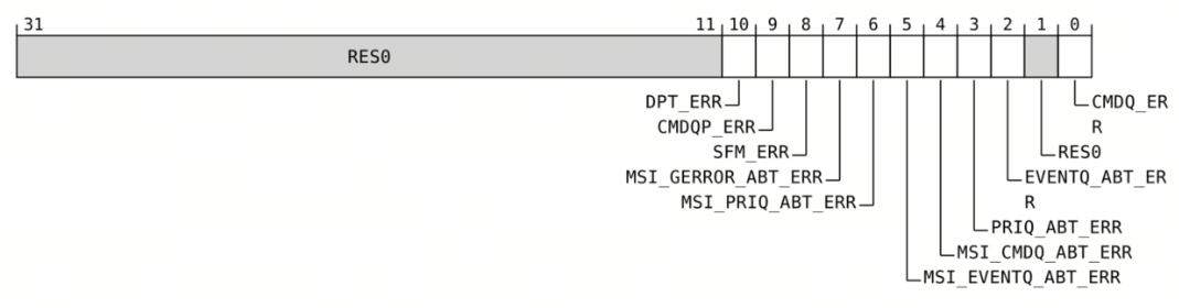 | [3] | PRIQ_ABT_ERR | PRI队列访问中止。当PRIQ_ABT_ERR设置时,SMMU将停止向事件队列中记录事件。 | |