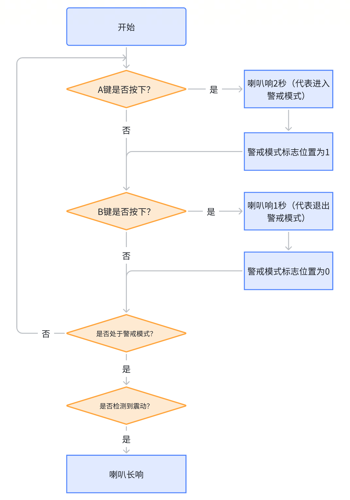 {HAL_Init(); /* 初始化HAL库 */stm32_clock_init(RCC_PLL_MUL9); /* 设置时钟, 72Mhz */led_init(); /* 初始化LED灯 */exti_init(); /* 初始化EXTI */alarm_init(); /* 初始化继电器 */uint8_t alert_mode = FALSE; //警戒模式标志while(1){ //A按键是否按下?if(buttonA_flag_get() == TRUE){alarm_on();delay_ms(2000);alarm_off();alert_mode = TRUE;}//B按键是否按下?if(buttonB_flag_get() == TRUE){if(alarm_status_get() == ALARM_STATUS_ON)alarm_off();else{alarm_on();delay_ms(1000);alarm_off();}alert_mode = FALSE;}//如果处于警戒模式if(alert_mode == TRUE){if(vibrate_flag_get() == TRUE)alarm_on();}elsevibrate_flag_set(FALSE);}