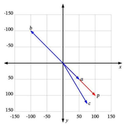 每个向量都有一个长度和方向。例如,在这个图中,p和a指向相同的方向,但长度不同。p和b正好指向相反的方向,但有相同的长度。然后还有c,长度比p短一点,方向不完全相同,但很接近。