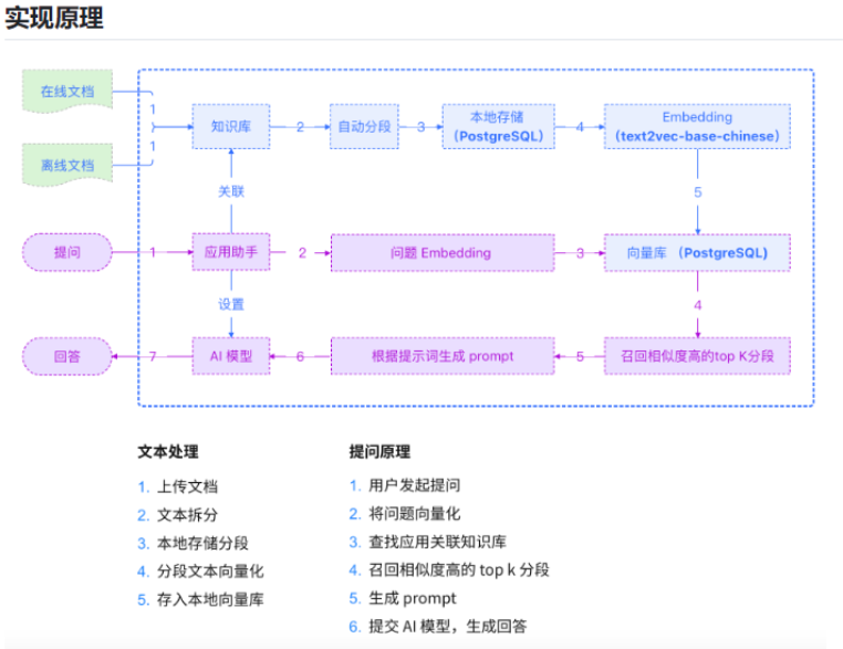 Markdown,然后将其转换为统一的纯文本格式。为了适应语言模型的上下文限制,文本被分割成更小的、可消化的块(chunk)。然后使用嵌入模型将块编码成向量表示,并存储在向量数据库中。这一步对于在随后的检索阶段实现高效的相似性搜索至关重要。知识库分割成chunks,并将chunks向量化至向量库中。