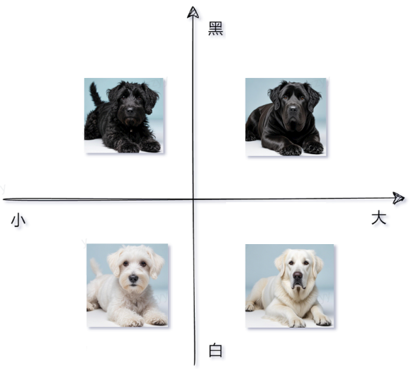 如我们所见,每个数值向量都有x和y坐标(或者在多维系统中是x、y、z,...)。x、y、z、...是这个向量空间的轴,称为维度。对于我们想要表示为向量的一些非数值实体,我们首先需要决定这些维度,并为每个实体在每个维度上分配一个值。