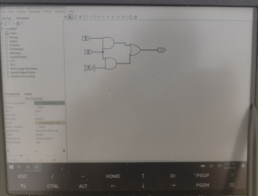 安装重启java环境生效,然后下载logisim-evolution的jar包,直接java -jar logisim-evolution-X.X.X-all.jar就可以运行了,在桌面上创建快捷方式命令就是java -jar xx.jar包,目录要正确才行,安装好是安装好了,但我发现在vnc下连线很难,可以在控制--显示设置中--启用termux:x11,启用高分辨率(可选),控制--图形加速--DRI3与Turnip+Zink(建议),最后是termux:x11偏好设置,可以设置返回时的小键盘,开了termux:x11返回是有小键盘的,但也可以设置关了,我个人是将一个键设为了Del键,方便删除logisim-evolution元器件,这个模式下连线是很好用的,如下图所示:
