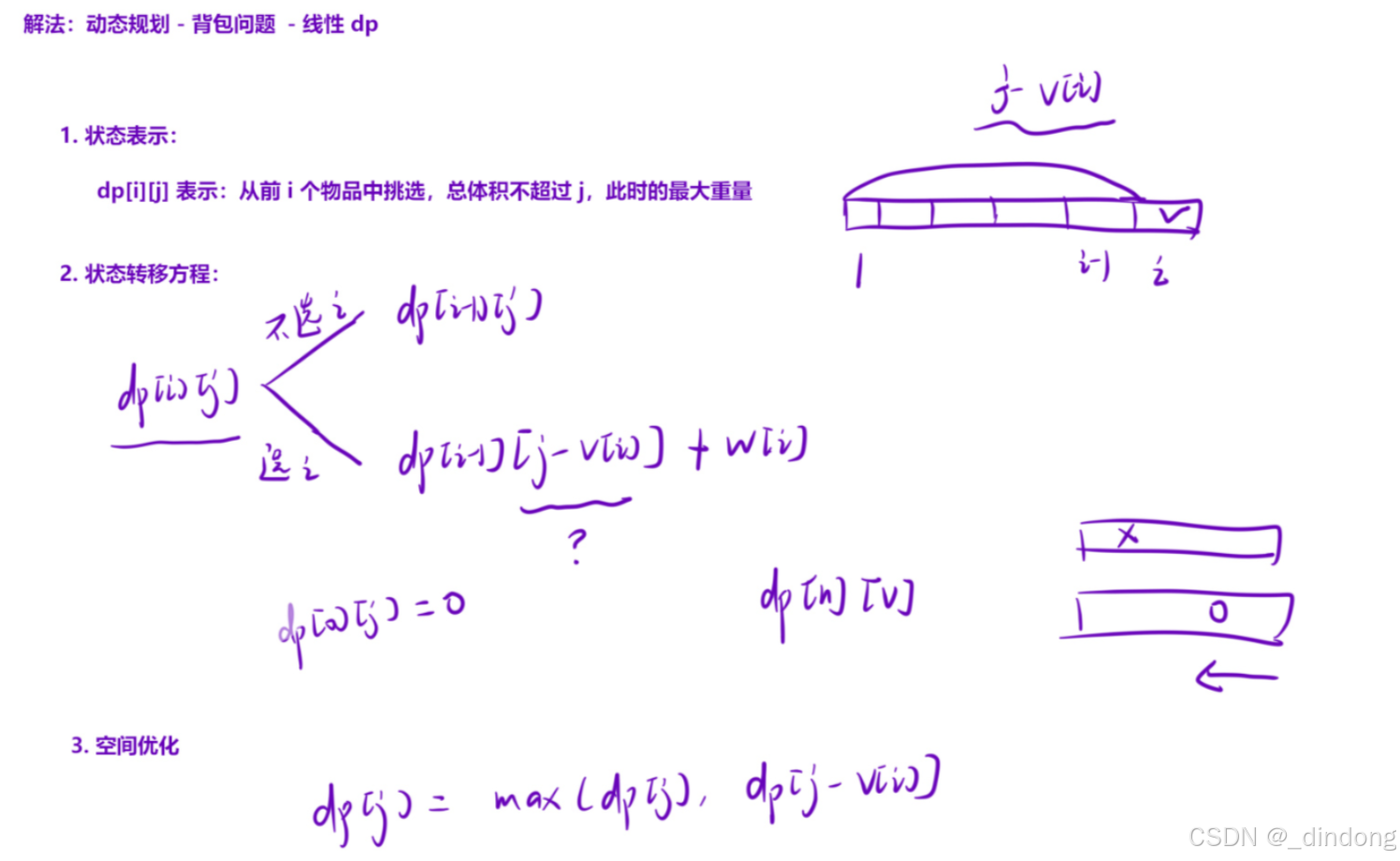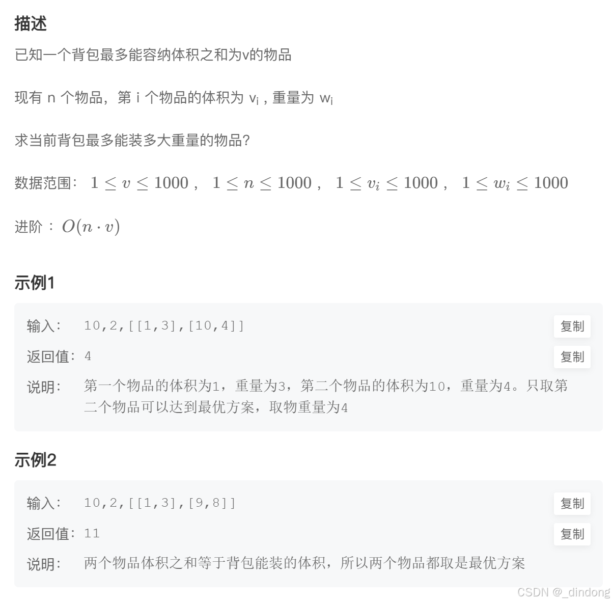 public:int dp[1010]={0};int knapsack(int V, int n, vector<vector<int> >& vw) {//体积不超过V的情况下 当前能够装下的最大重量//dp[i][j]表示从前i个物品选,体积不超过j的最大重量for(int i=0;i<n;++i)for(int j=V;j>=vw[i][0];--j)dp[j]=max(dp[j],dp[j-vw[i][0]]+vw[i][1]);return dp[V];}