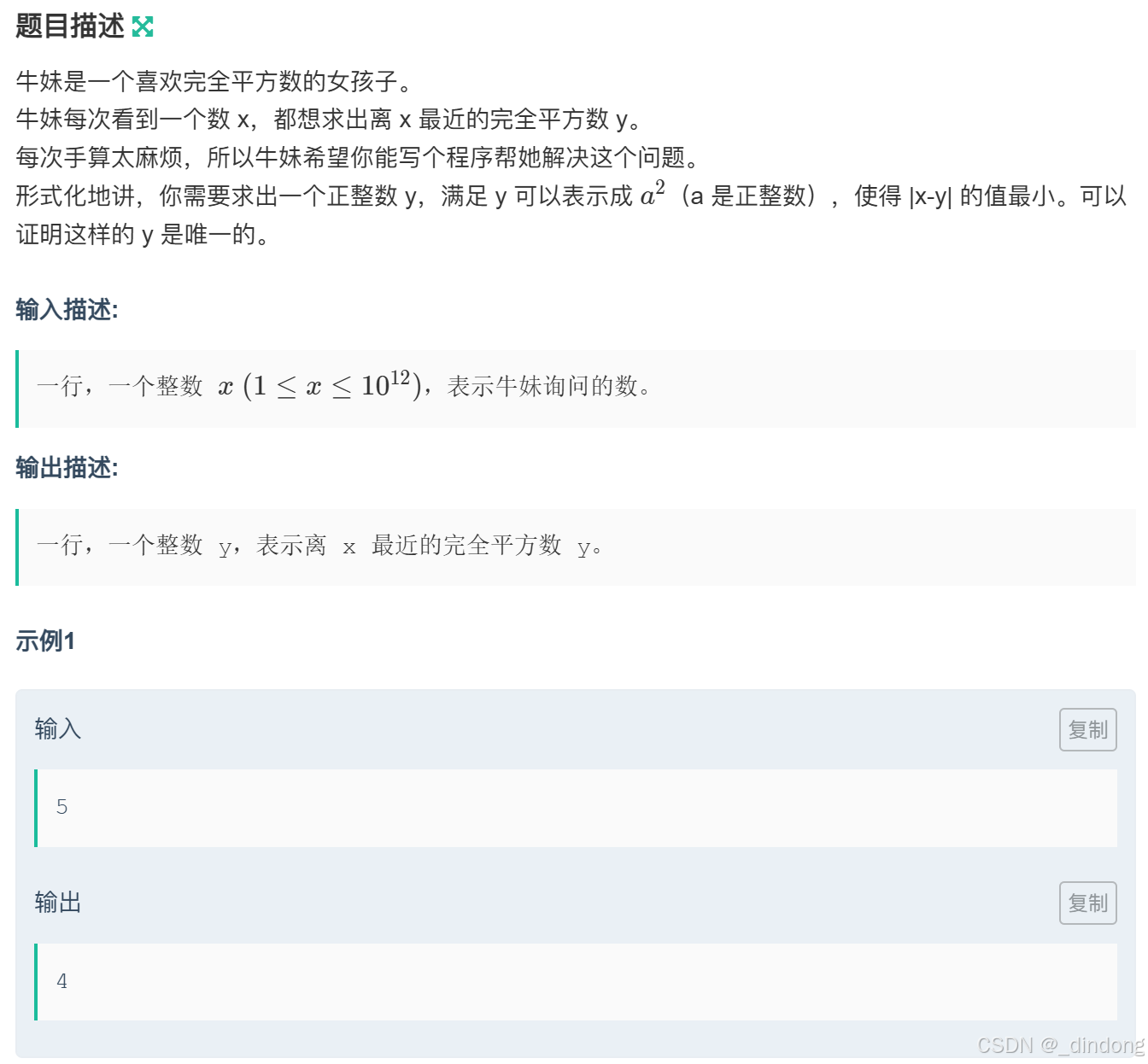 int main(){LL x;cin>>x;LL a=sqrt(x);LL x1=a*a,x2=(a+1)*(a+1);if(x2-x>x-x1) cout<<x1<<endl;else cout<<x2<<endl;
