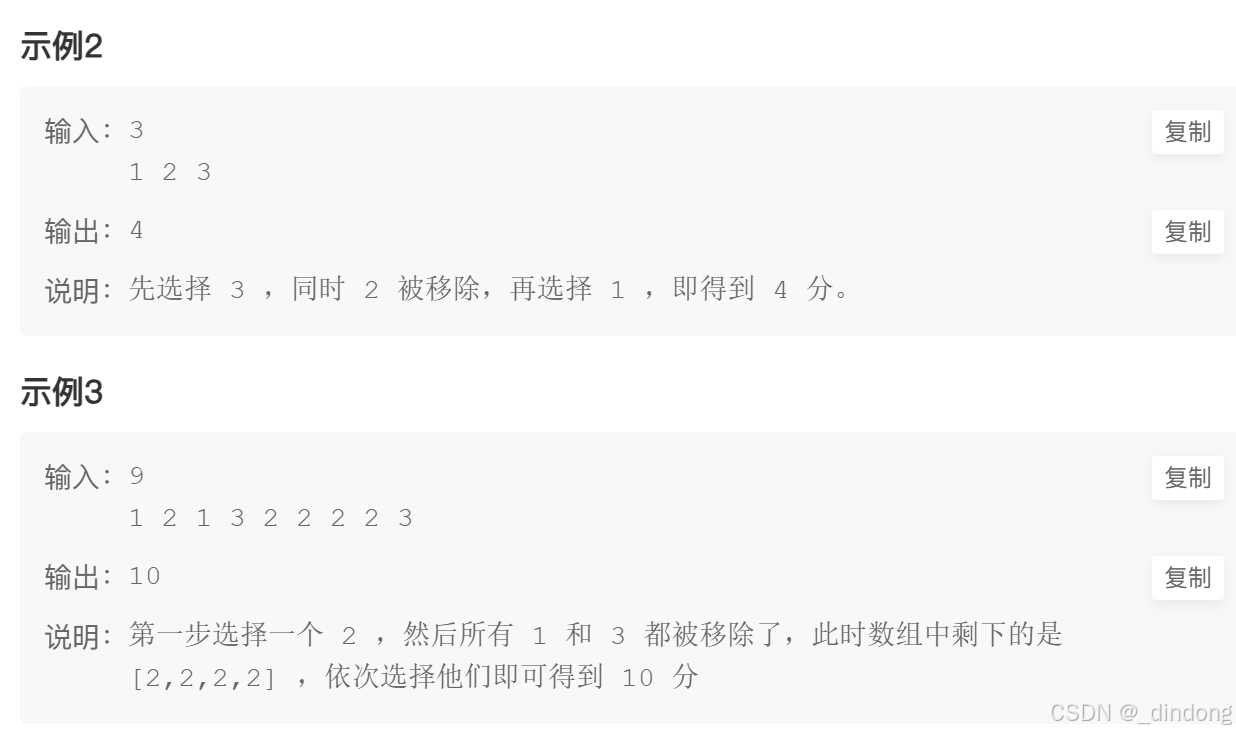 我们将数据先存进count,count[某个数]=该数之和,建立映射关系,如果选了这个数,那么这个数-1/+1就不都不能选,相当于不能连续选的意思,接下来用这个数组取填dp表就行了。
