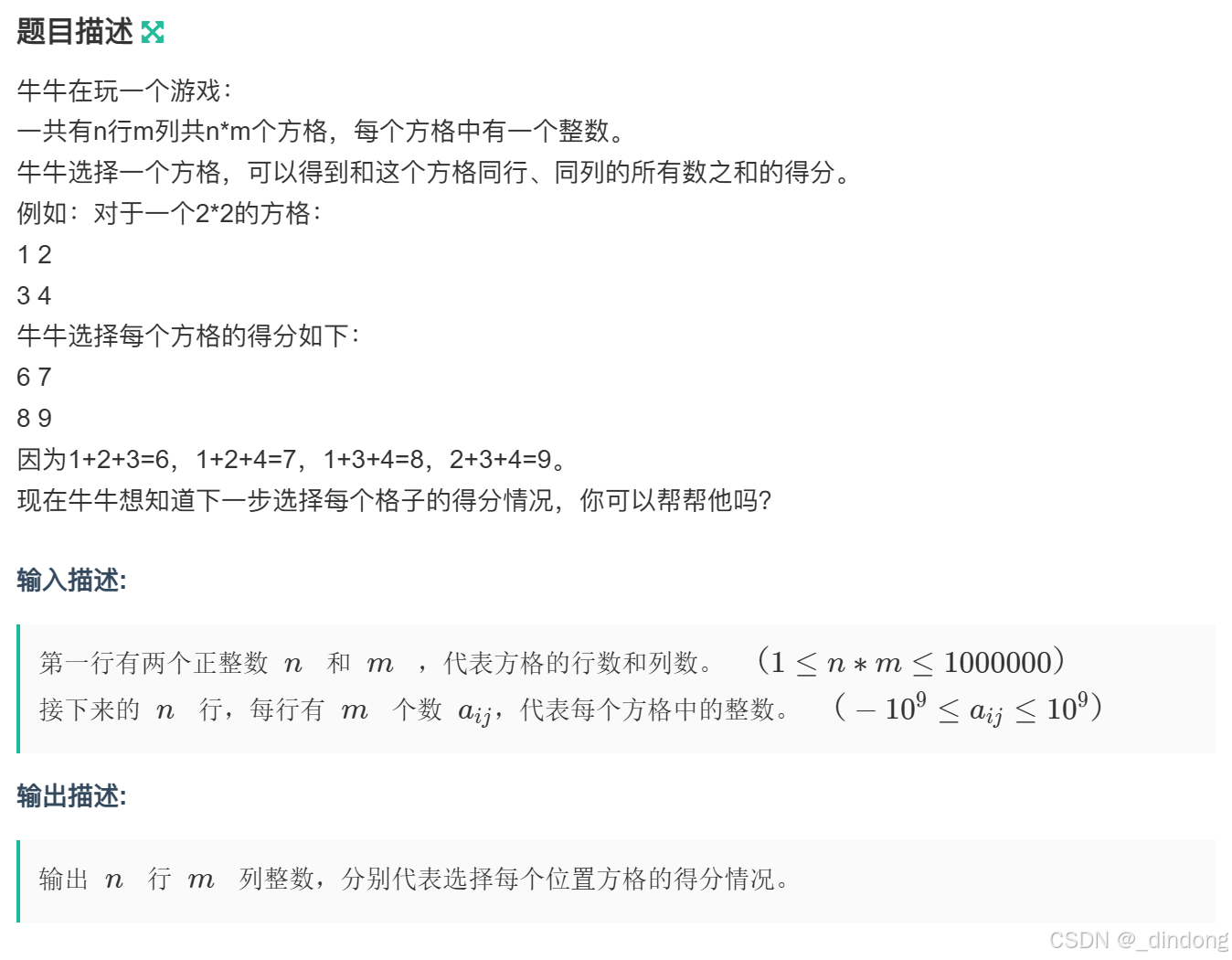 int main() {int n,m;cin>>n>>m;vector<vector<long long>> arr(n,vector<long long>(m));vector<long long> row(n);vector<long long> col(m);for(int i=0;i<n;++i){for(int j=0;j<m;++j){scanf("%lld",&arr[i][j]);row[i]+=arr[i][j];col[j]+=arr[i][j];}}for(int i=0;i<n;++i){for(int j=0;j<m-1;++j){arr[i][j]=(row[i]+col[j]-arr[i][j]);cout<<arr[i][j]<<" ";}arr[i][m-1]=(row[i]+col[m-1]-arr[i][m-1]);cout<<arr[i][m-1]<<endl;}return 0;