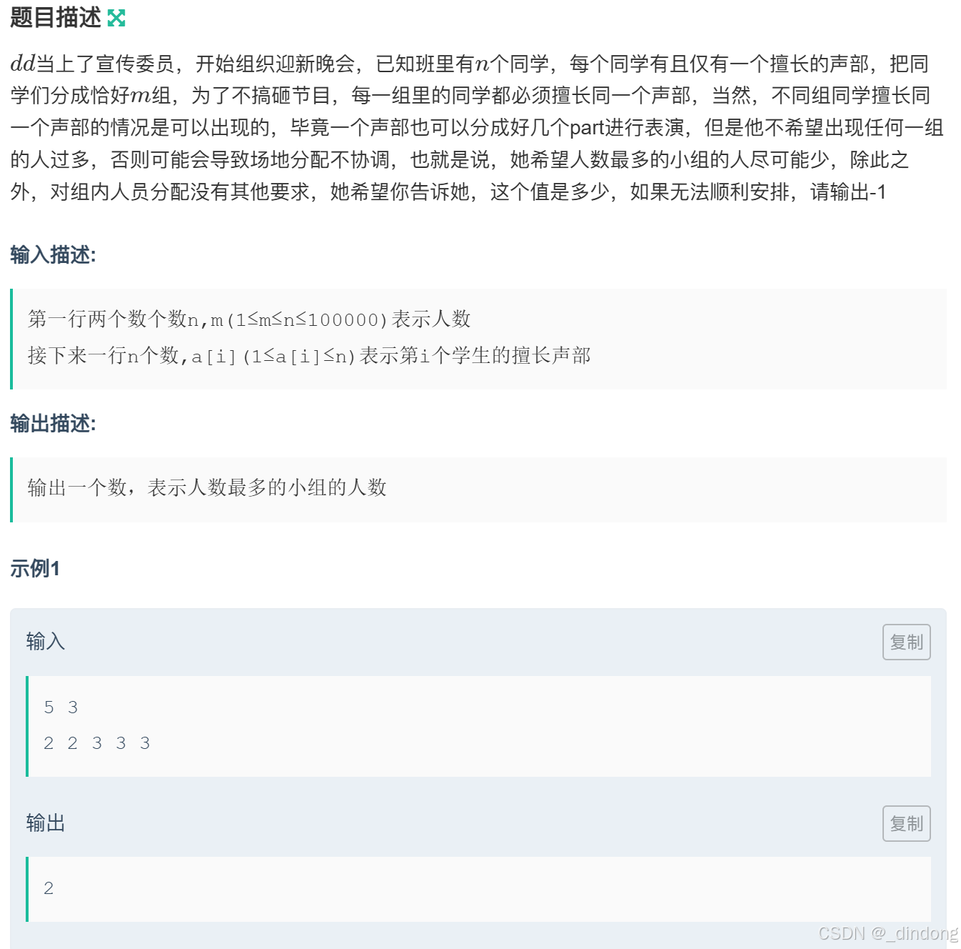 {unordered_map<int,int> hash;cin>>n>>m;for(int i=0;i<n;++i){//注意key是arr[i]不是icin>>arr[i];++hash[arr[i]];if(hash[arr[i]]>hmax)hmax=hash[arr[i]];}int kinds=hash.size(),ret=0;if(kinds>m)cout<<-1;else { int left=1,right=hmax;while(left<right){int mid=left+(right-left)/2;if(check(mid,hash))right=mid;else left=mid+1;}cout<<left;}return 0;