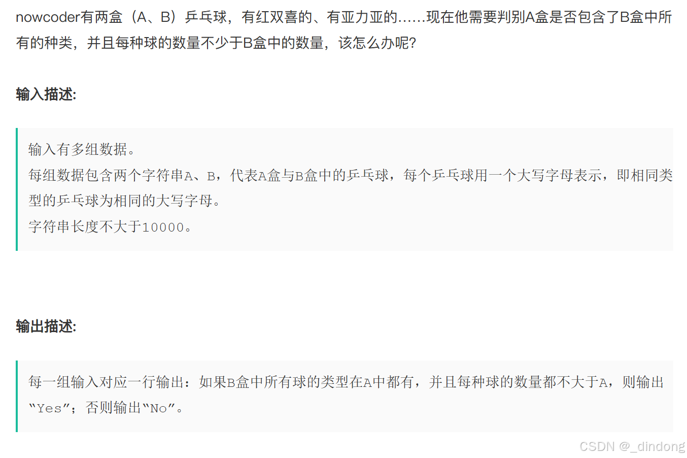 或者先遍历s1,然后遍历s2,如果hash[]<0说明s1包不住s2,cout<<"No",此外,对于这种二元判断的,我们可以添加一个bool变量来实现cout哪个,这样就不用写两个return了