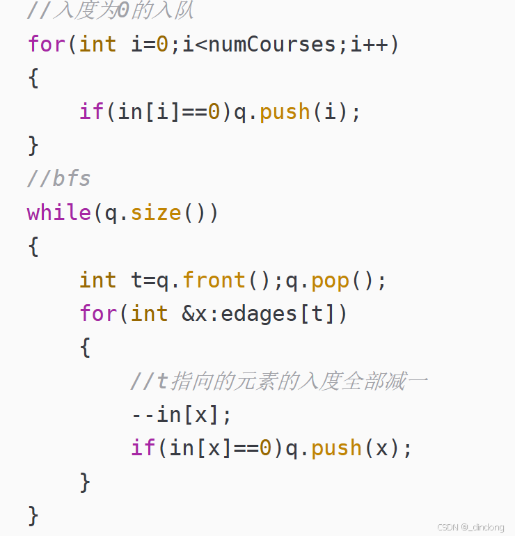 然后还需要额外创建一个数组统计入度,因为每层bfs我们处理的都是入度为0的点,开始bfs前先将所有入度为0的源点入队,然后每层dfs,取完队头元素,将队头元素指向的所有结点入度减去1,如果有变成入度为0的