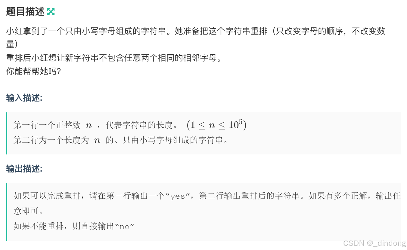{int n;string s;cin>>n>>s;int MaxCount=0,hash[26]={0};char MaxChar;for(auto&ch:s){if(++hash[ch-'a']>MaxCount){MaxCount=hash[ch-'a'];MaxChar=ch;}}if(MaxCount>(n+1)/2)cout<<"no";else{cout<<"yes"<<endl;//处理出现次数最多的那个int index=0;while(MaxCount--){s[index]=MaxChar;index+=2;}//处理剩下的for(int i=0;i<26;++i){if(hash[i]&&i!=MaxChar-'a'){char chr=i+'a';while(hash[i]--){if(index>=n)index=1;s[index]=chr;index+=2;}}}cout<<s;}return 0;