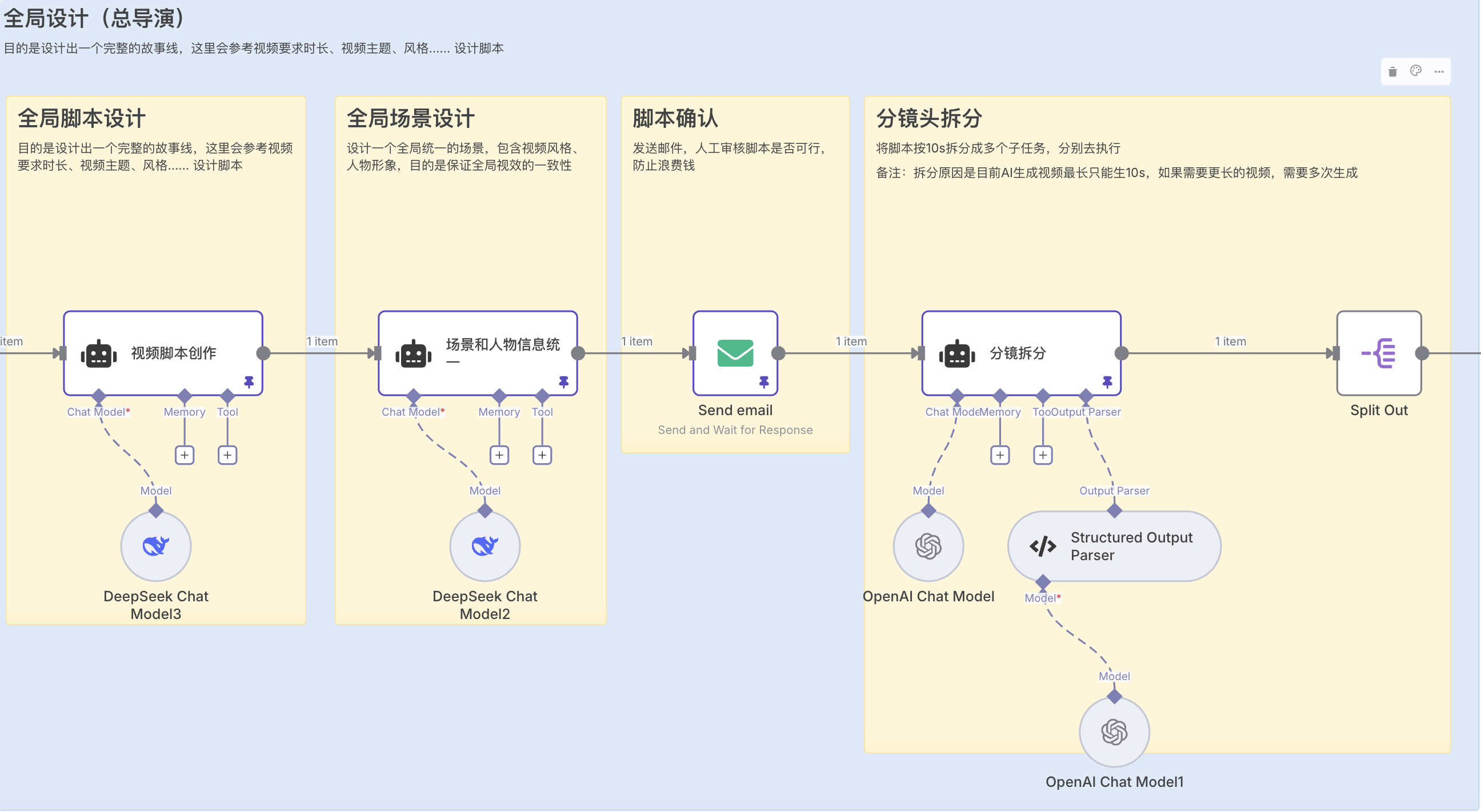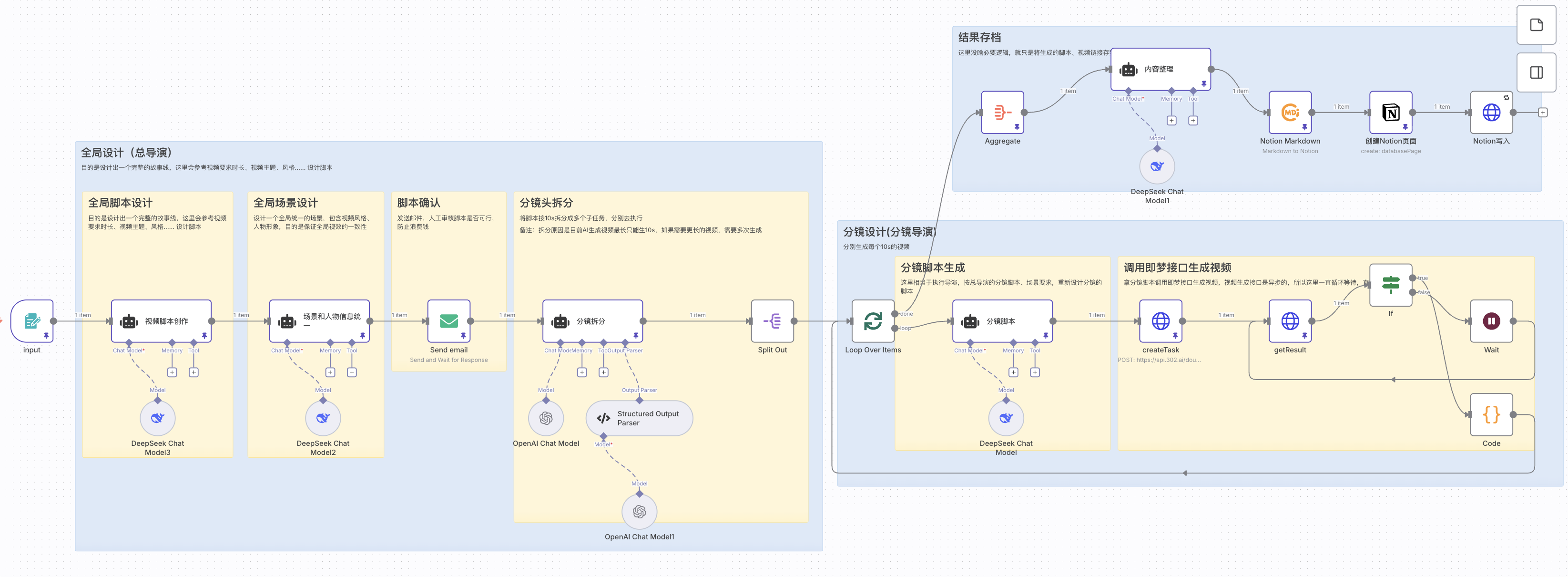 经过半天的摸索和调试,最终实现了一个AI含量100%的视频生成系统,涵盖了从脚本创作、分镜设计、视频生成完整链路。整个工作流的自动化程度达到90%以上,仅在最后的素材拼装环节需要人工介入。旁白部分并不包含在工作流里,不是因为实现不了,只是单纯没做而已。