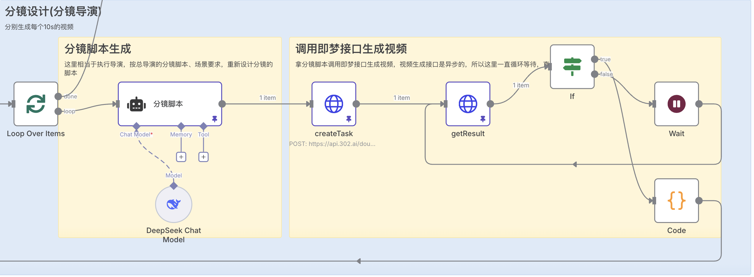 异步轮询等待:由于视频生成需要时间,工作流会自动启动一个轮询机制,持续检查视频是否生成完毕,直到成功获取到视频文件,再继续处理下一个镜头。