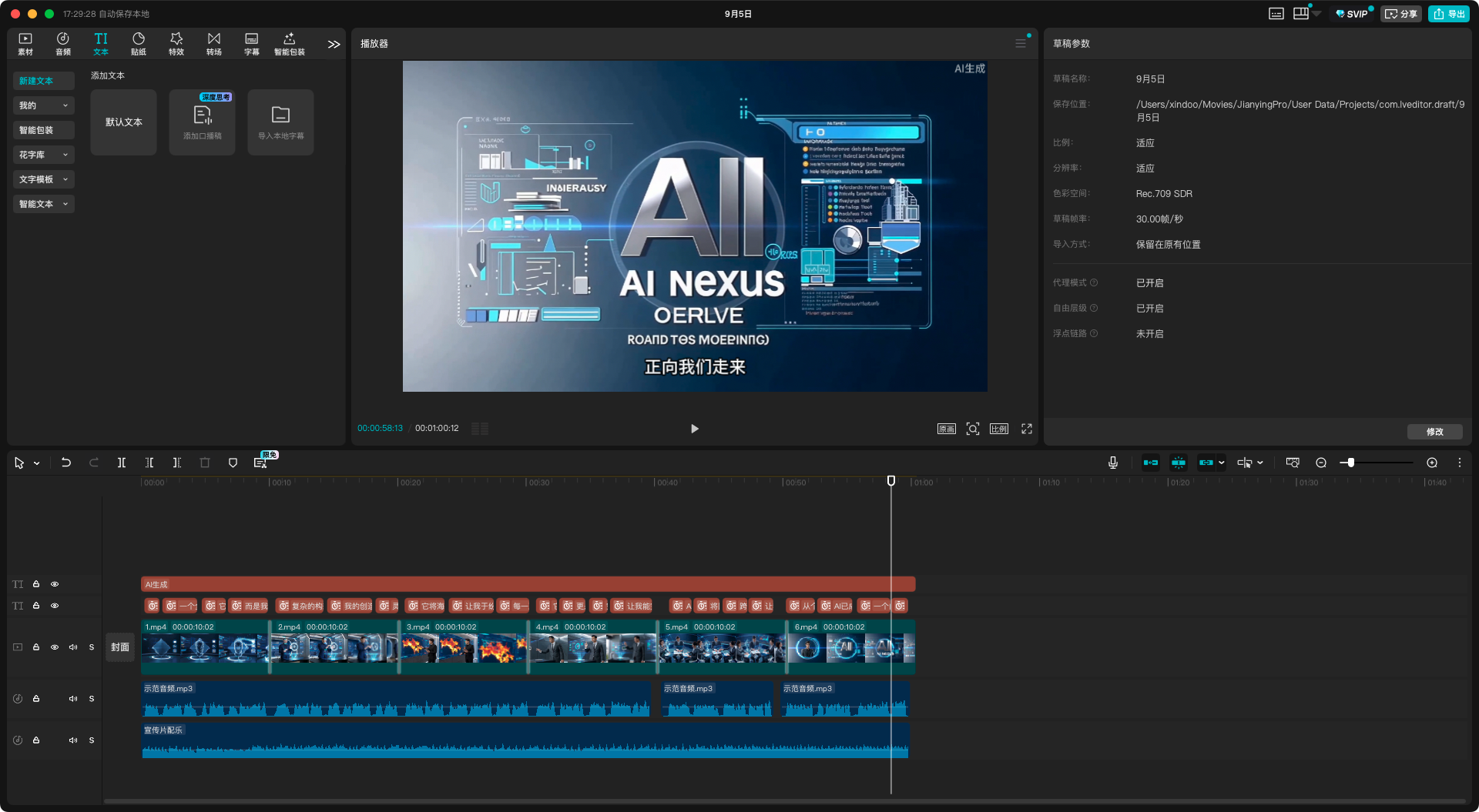 这是目前唯一无法自动化的步骤,因为所有素材都是由AI独立生成的,彼此之间缺乏必然的关联性。在此阶段,需要使用剪映等视频编辑软件将生成的视频片段、旁白音频和背景音乐组装并同步。通过调整视频转场、音频淡入淡出和时间轴对齐,确保最终成片流畅连贯。