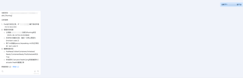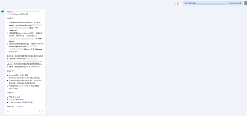 场景:收到告警“Pod 重启频繁”,传统流程需要我手动执行一系列 kubectl 命令,对比事件、日志和资源状态,耗时耗力。