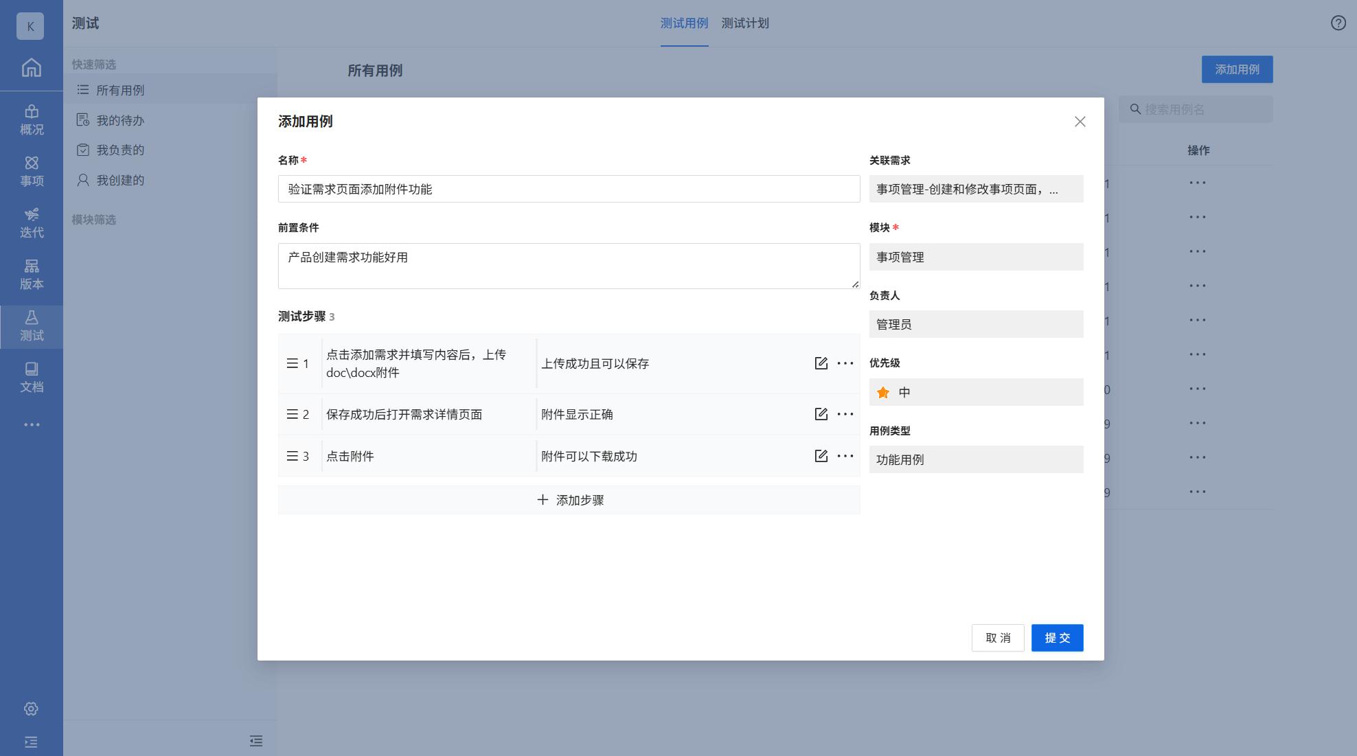 进入项目->测试->添加用例,填写用例标题等条件后,点击提交,用例保存成功