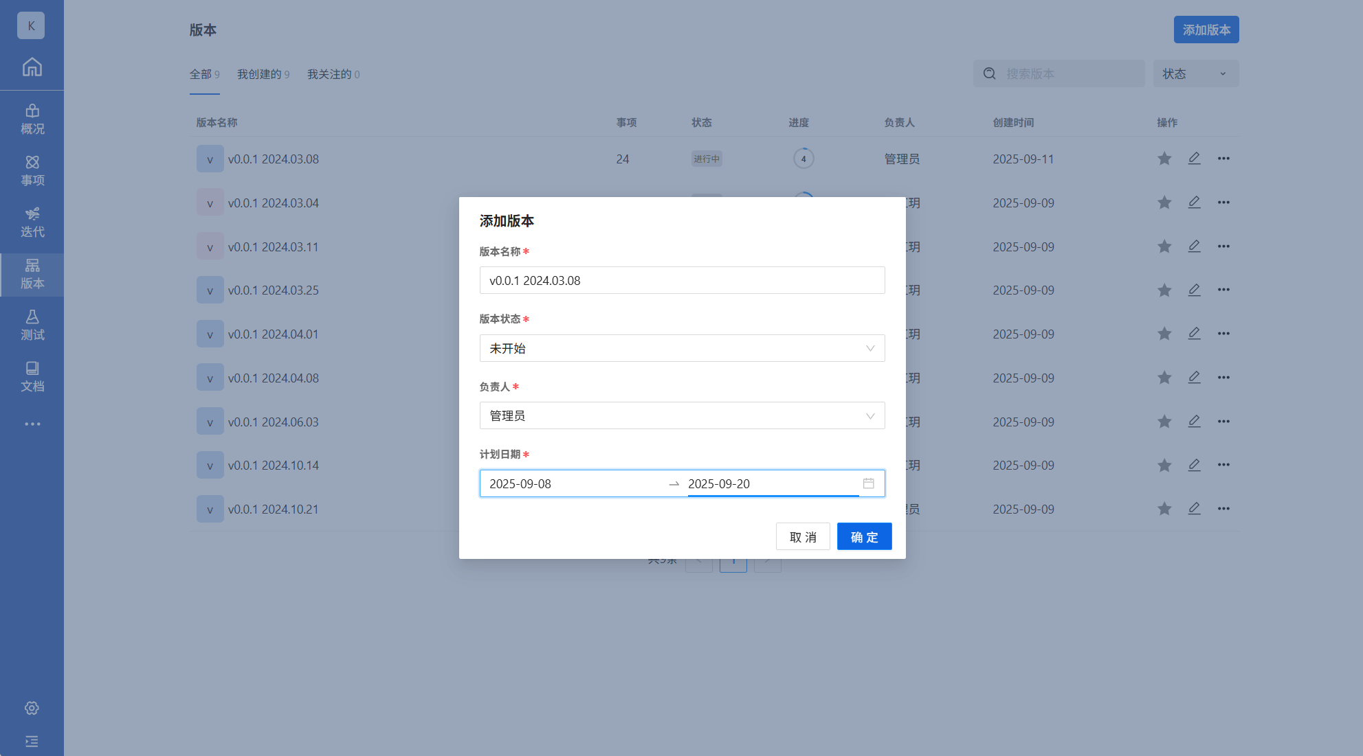 版本 | 根据项目需求和发布计划,合理规划版本的数量和时间点。并围绕版本来组织迭代和事项 |